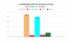 A legfrissebb közvéleménykutatás. Friss közvélemény-kutatást közölt a XXI. Század Intézet. Így alakul a pártok támogatottsága. A XXI. Század Intézet által november 29. és december 1. között végzett kutatása azt mutatja, hogy a Fidesz tovább tudott erősíteni a pozícióján (plusz egy százalékpontos javulás az október eleji méréshez képest), míg a Tisza rontott (mínusz egy pont). Az intézet szerint el lehet mondani, hogy az adatok alapján Magyar Péter pártja elérte a növekedési plafont, összegyűjtött minden korábbi ellenzéki protest szavazatot. Jelenleg az állás a politikailag aktívak bázisán: Fidesz 45, Tisza 40 százalék.